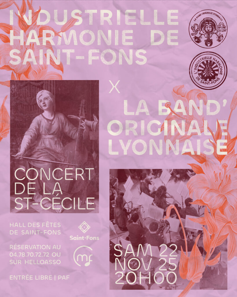 Nous sommes très heureux d’être invités à fêter la Sainte Cécile par l’Industrielle Harmonie de Saint Fons le samedi 22 novembre à 20h au Hall des fêtes de Saint-Fons. Venez découvrir nos deux orchestres sur un programme varié !